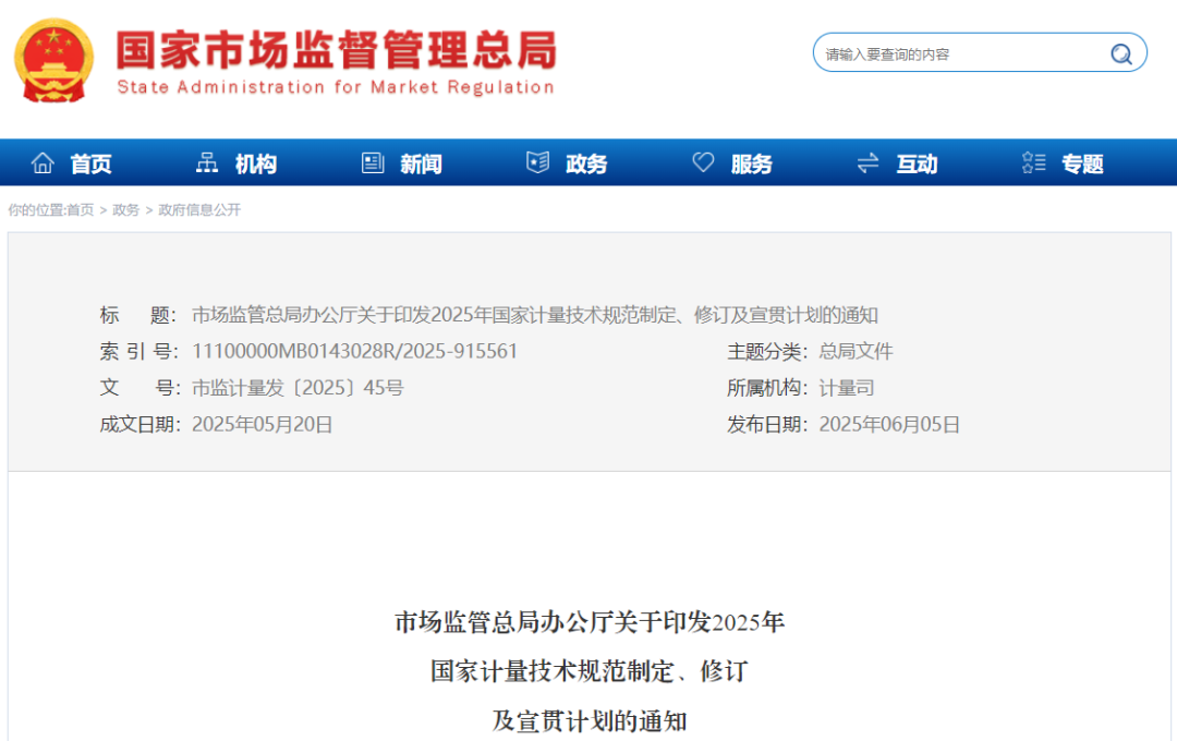6月5日,市场监管总局发布关于印发2025年国家计量技术规范制定、修订及宣贯计划的通知,公布了401项2025年国家计量技术规范制定、修订计划项目。